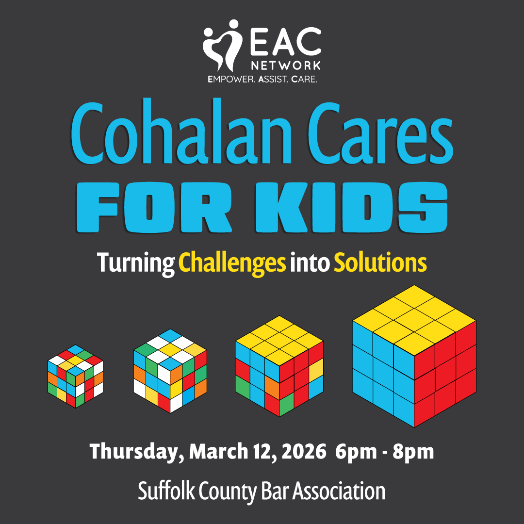 Please join EAC Network at its upcoming Cohalan Cares for Kids Event. This event will bring awareness to and benefit EAC Network’s Suffolk County Children’s Center at Cohalan Court, a child care center where children play and learn while parents or guardians tend to their court business.